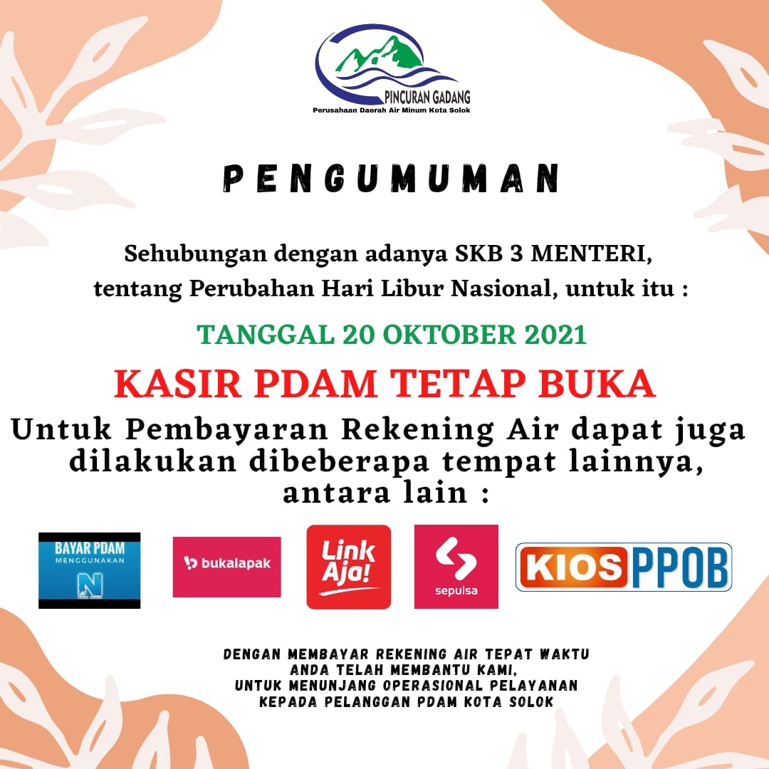 Jangan Lupa Tagihan Airnya .... Untuk Hari Rabu, 20 Oktober 2021 Kasir PDAM Kota Solok tetap buka..