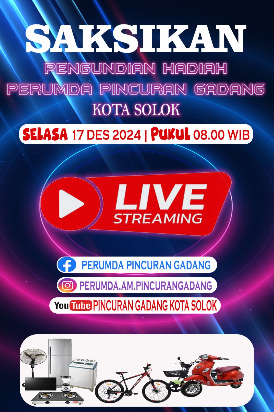 Assalamualaikum, salam untuk semua,jangan lupa saksikan LIVE STREAMING pengundian Doorprizes  dalam rangka Ulangtahun PERUMDA PINCURAN GADANG KOTA SOLOK KE 1 DAN PDAM KE 42 kami akan mengundi  doorprize pelanggan yang membayar air tepat waktu.acara ini LIVE di media sosial kami dibawah ini